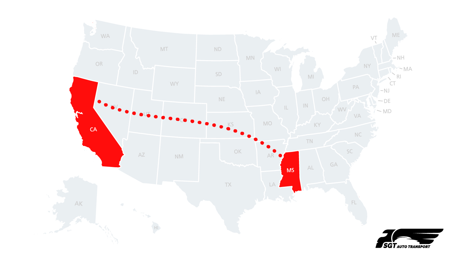 | West Coast to Deep South Route | California to Mississippi is a commonly serviced auto transport corridor connecting the West Coast with the Southern United States. |