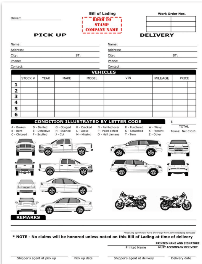The Bill of Lading (BOL), also called the "Condition Report", is a required document that serves as a receipt of freight service. You will be given this document by the carrier who picks up your vehicle. The information regarding your shipment will be pre-filled by the transport company. You'll need to inspect your vehicle and mark any visible damages with the carrier at the time of pickup as well as at the time of delivery.